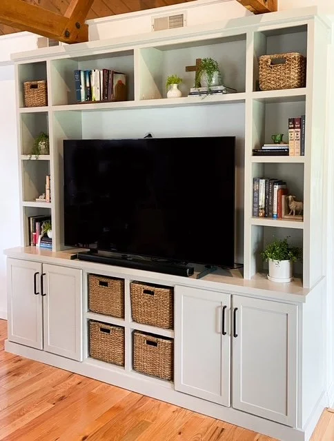 Entertainment center with adjustable shelves, four enclosed cabinets and matching cubbies.