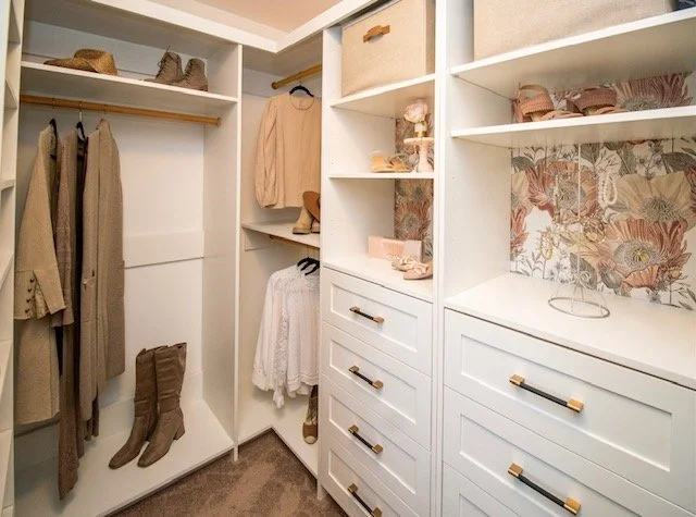 Custom walk-in closet with twin drawer towers, hanging clothes racks, adjustable shelves, shoe rack and contemporary barn door.